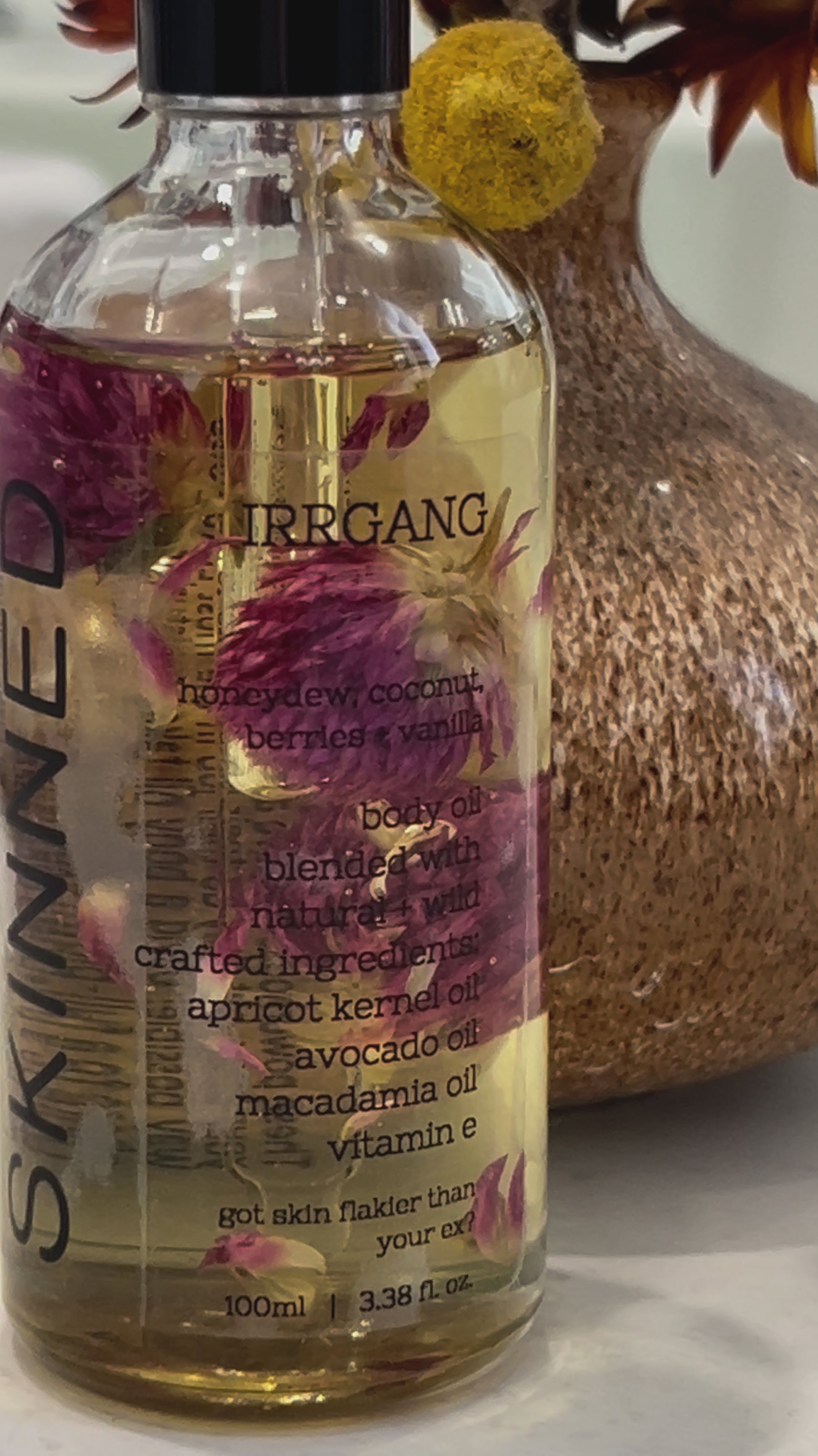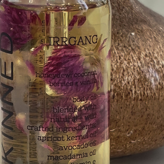 Introducing IRRGANG's custom blend with SKINNED—a signature scent that’s pure paradise. With notes of honeydew, coconut, berries, and vanilla, this body oil will leave you smelling like heaven. Enhanced with delicate Gomphrena Globes for an added touch of beauty, it’s a sensory escape to an exotic getaway every time you catch a whiff.